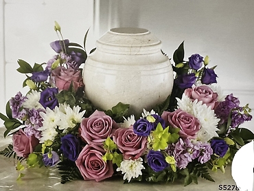 This Urn Arrangement includes: dark purple lisianthus, lavender roses, light purple stock, white cushion mums, and greenery including ivy plant.
